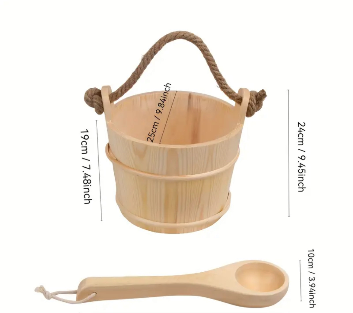 Sada saunových kbelíku a dřevěné lžíce vyrobená z vysokokvalitního smrkového dřeva, s plastovou podložkou z materiálu PC uvnitř sudu, vhodná pro použití v saunovém pokoji.